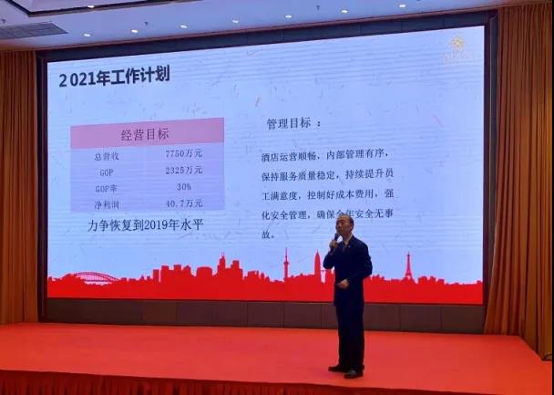在對2020年度工作全面總結中,酒店經(jīng)營班子肯定了全體員工在過去一年的辛勤付出和取得的經(jīng)營成效,并對2021年度工作目標進行了部署和動員。