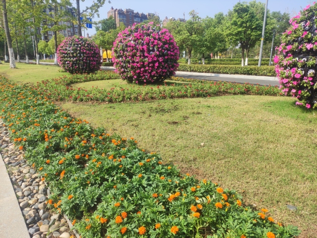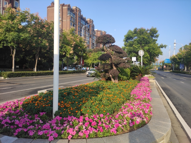 水韻路中分帶的花球也換上了新裝,10個巨大的牽牛花球被紅黃色的花帶簇?fù)碇?,在太陽下盡情地綻放著,像是小孩的笑臉,歡快地為祖國母親慶生。