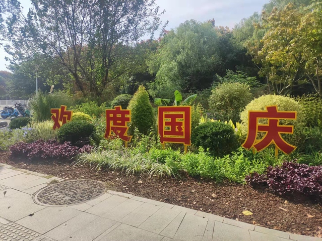 樂山路和夢都大街的東南角節(jié)點是新增加的花境景觀,使用了完美冬青、迷迭香、金葉蕕等二十多個草花品種,錯落有致的草花搭配和花境中豎起的“歡度國慶”標(biāo)語牌,烘托出熱烈的節(jié)日氣氛。