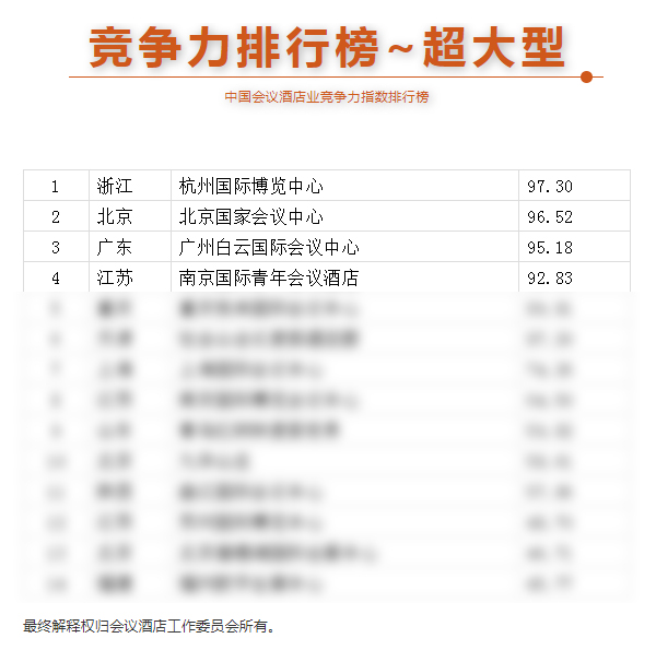本屆榜單按照酒店的規(guī)模體量分為超大型、大型、中型、小型四個(gè)類別,從上一年度承接會(huì)議數(shù)量和規(guī)模、會(huì)議室容量和數(shù)量、客房總數(shù)、渠道客評(píng)、經(jīng)營(yíng)數(shù)據(jù)等多方面進(jìn)行綜合評(píng)價(jià),經(jīng)數(shù)據(jù)調(diào)研、專家評(píng)審等多個(gè)環(huán)節(jié)細(xì)致評(píng)估,得到了相對(duì)客觀準(zhǔn)確的評(píng)選結(jié)果。國(guó)青酒店憑借自身場(chǎng)地優(yōu)勢(shì)、對(duì)會(huì)議客戶市場(chǎng)的探索及挖掘、專業(yè)的會(huì)議接待服務(wù),贏得了專家評(píng)委及企業(yè)買家的認(rèn)可,在榜單中以總分92.83的好成績(jī)位列全國(guó)第四。