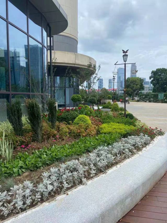 萬景園北入口項(xiàng)目將原始花壇改造成弧形整石花壇,常夏石竹、八仙花、女貞球等彩葉花灌木鋪滿在景觀石的四周,形成植物品種豐富、層次分明的小型花境。入口處增設(shè)標(biāo)有“萬景園”字樣高達(dá)12米的立牌,高大醒目,與魚嘴公園、青年文化公園、綠博園形成了統(tǒng)一的濱江風(fēng)光帶入口標(biāo)識(shí)。
