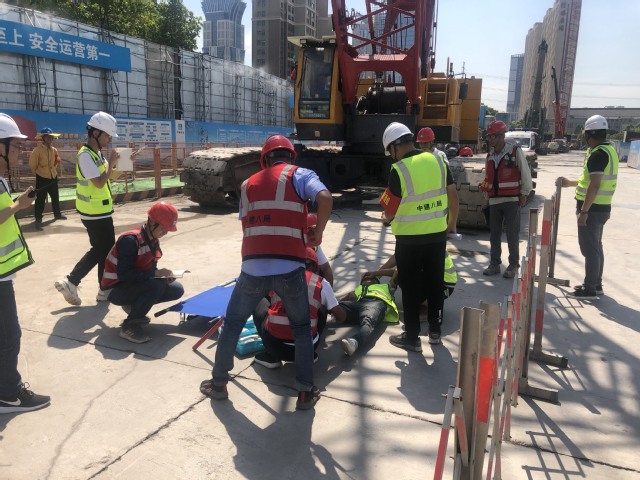 本次應(yīng)急演練活動模擬施工現(xiàn)場履帶式起重機(jī)在作業(yè)過程中由于鋼絲繩斷裂,吊物從高處掉落倒下,不幸將地面一名作業(yè)人員腳部砸傷的事故。現(xiàn)場專職安全員發(fā)現(xiàn)后第一時(shí)間向應(yīng)急救援指揮部匯報(bào),應(yīng)急救援指揮部立即啟動應(yīng)急預(yù)案,各應(yīng)急救援小組接到救援命令后,迅速跑向事故地點(diǎn),對受傷人員開展救援工作,同時(shí)拉起警戒線,保護(hù)現(xiàn)場。救援人員按預(yù)案分工,有條不紊地實(shí)施清障、包扎、傷員擔(dān)架固定、運(yùn)送上救護(hù)車等一系列動作。本次演練活動,增強(qiáng)了員工的安全操作意識,提高了快速反應(yīng)能力、應(yīng)急救援能力以及協(xié)同作戰(zhàn)能力。