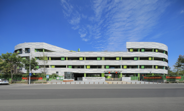 河西新城四小位于南京市建鄴區(qū)江山大街以北、黃山路以東,建筑面積2.79萬(wàn)平方米,教學(xué)樓主體4層,局部3層,地下1層,建筑高度16.95米,可容納教職工和學(xué)生1705人。建筑整體采用扁平化“曰”字形結(jié)構(gòu),包含傳道授業(yè)的教學(xué)理念,造型可演化為鉛筆、書籍、綠葉,寓意在學(xué)習(xí)中獲得知識(shí)、不斷成長(zhǎng)。