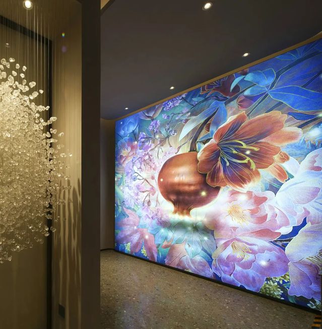 “人間歡喜事,石榴成熟時”,藝術(shù)生活館中一幅瑰麗絢爛的手繪花神圖渲染出主題氛圍,鮮花簇?fù)眍w粒飽滿石榴的畫幅,姹紫嫣紅中,將奧體公司開發(fā)的奧體新城各小區(qū)名稱中的植物元素有機(jī)組合在一起,觀眾置身其中,仿佛能聞到花的芳香、看到石榴籽的晶瑩剔透。畫面寓意著花開興隆、興旺昌盛,祝福幸福美好生活紅紅火火,也體現(xiàn)了河西集團(tuán)“開發(fā)幸福、運營美好”的經(jīng)營理念。整幅花神圖由特邀手繪師親繪而成,十分珍貴。