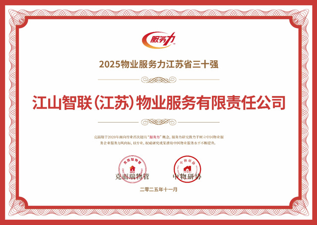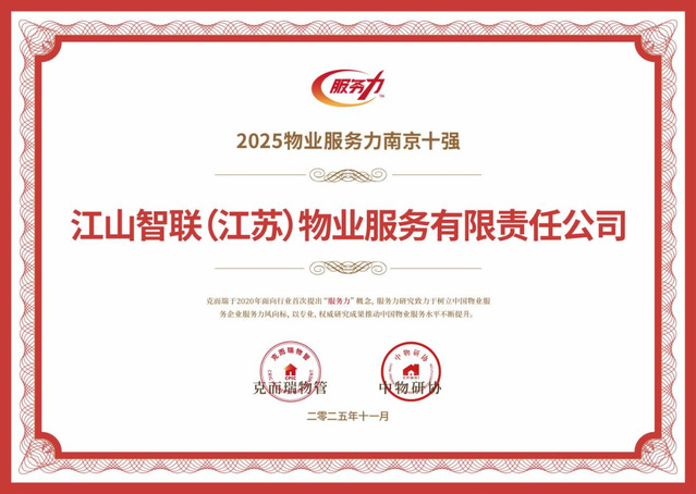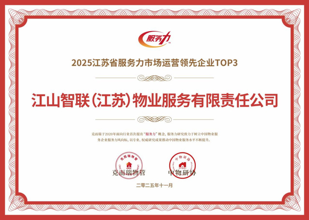 河西集團(tuán)江山智聯(lián)物業(yè)憑借卓越的服務(wù)品質(zhì)與前瞻的戰(zhàn)略布局,一舉斬獲2025南京國(guó)有物業(yè)服務(wù)力領(lǐng)先企業(yè)TOP1、2025江蘇省服務(wù)力市場(chǎng)運(yùn)營(yíng)領(lǐng)先企業(yè)TOP3、2025物業(yè)服務(wù)力南京十強(qiáng)、2025物業(yè)服務(wù)力江蘇省三十強(qiáng)、2025華東區(qū)域物業(yè)服務(wù)力百?gòu)?qiáng)企業(yè)、五項(xiàng)行業(yè)重磅榮譽(yù)。
